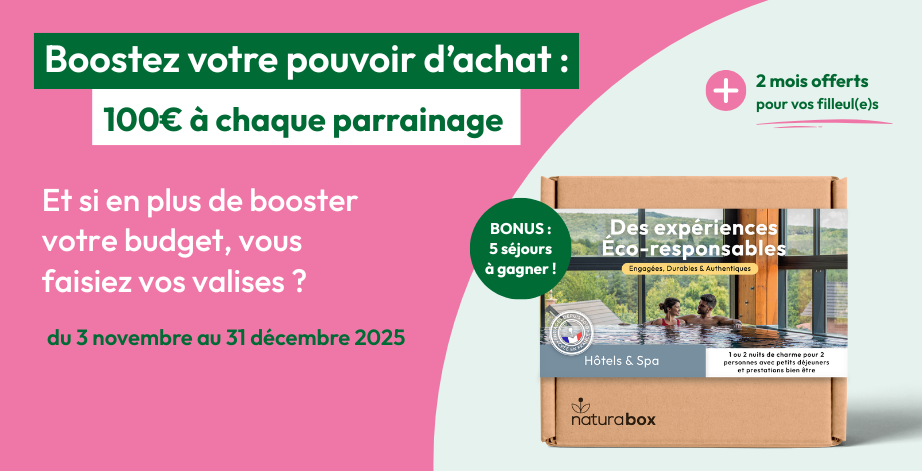 Du 3 novembre au 31 décembre 2025 tous les parrains participent automatiquement au tirage au sort pour tenter de gagner 5 séjours. 5 NaturaBox sont à remporter : plus vous parrainez, plus vous multipliez vos chances de gagner ! Tirage au sort prévu le mercredi 7 janvier 2026.